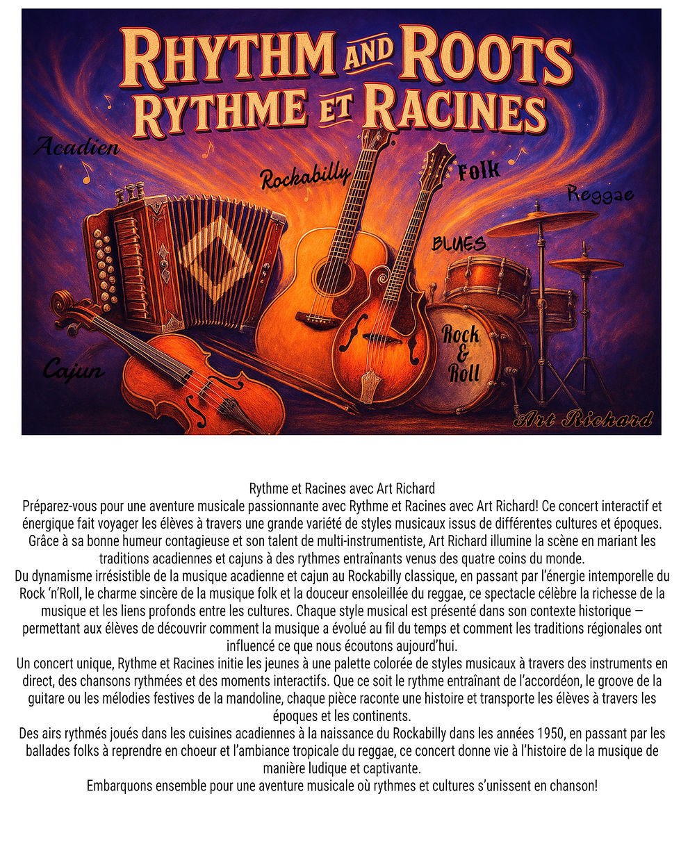 A multi-instrumentalist, Art offers a variety of shows, from "Le Tintamarre" to "Bonjour Canada." Community involvement is key for him, as he encourages Acadian and francophone pride.
